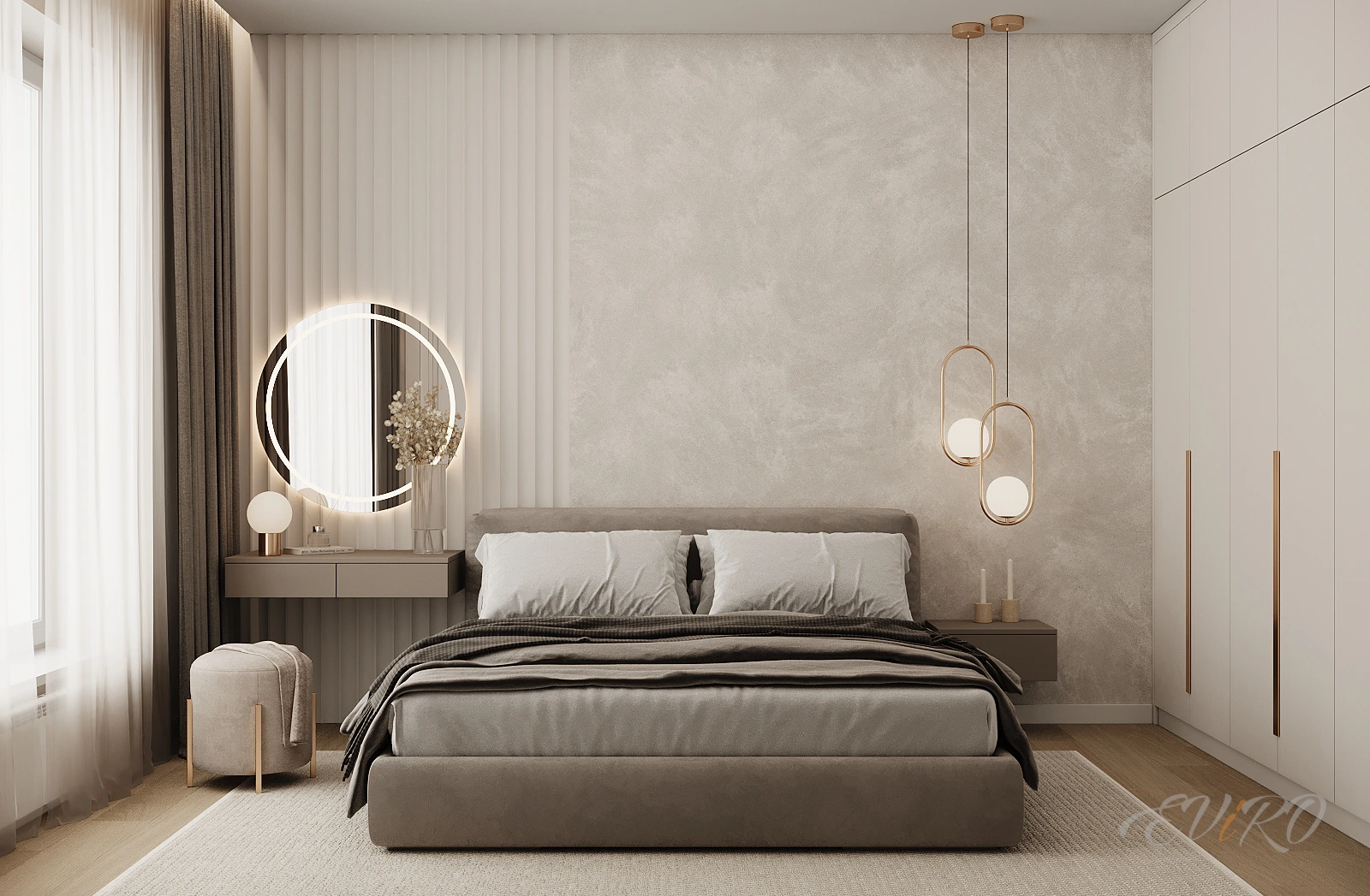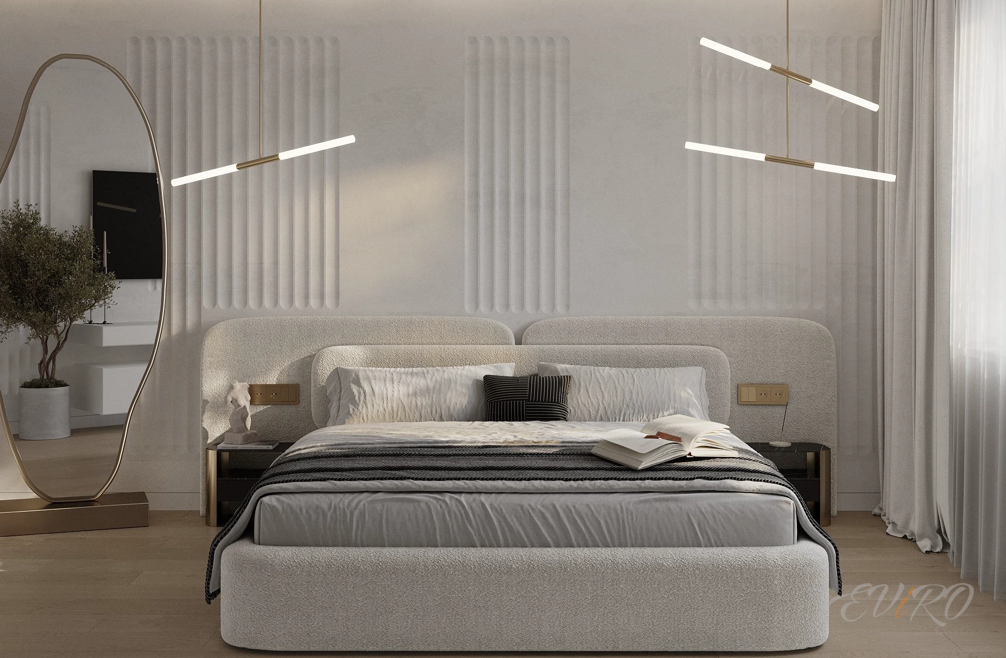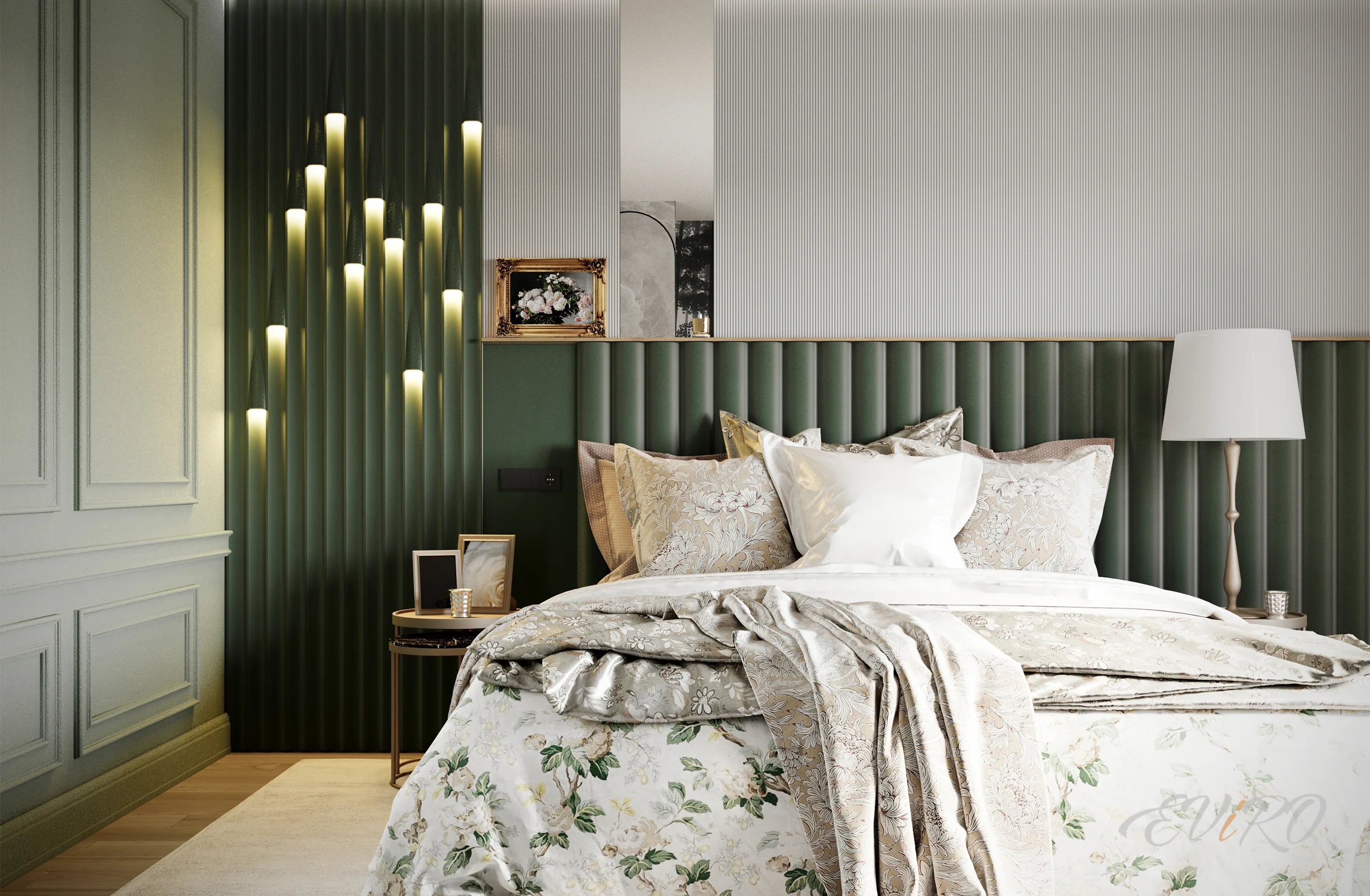 Благодаря своей текстуре и объему, 3D панели Eviro Спарта создают игру света и тени, оживляя пространство и придавая ему глубину. Вертикальная ориентация панелей визуально увеличивает высоту потолков, делая комнату более просторной и воздушной. Гипсовые панели отличаются экологичностью и безопасностью, что делает их идеальным выбором для спальни.