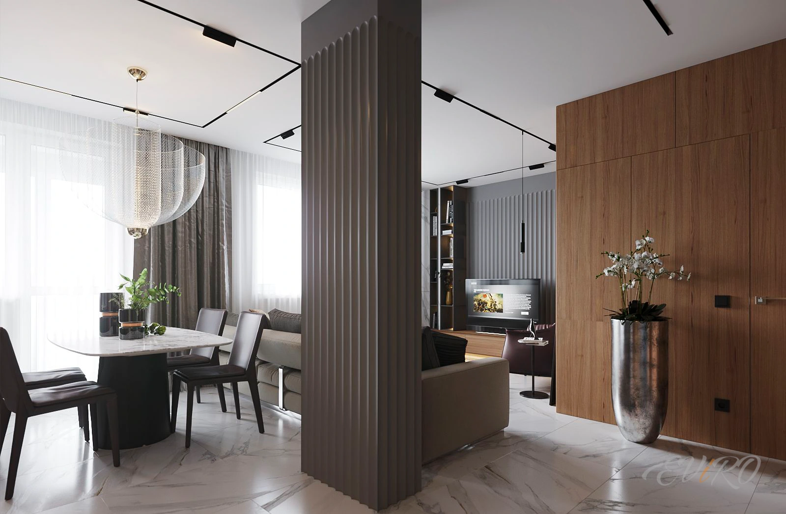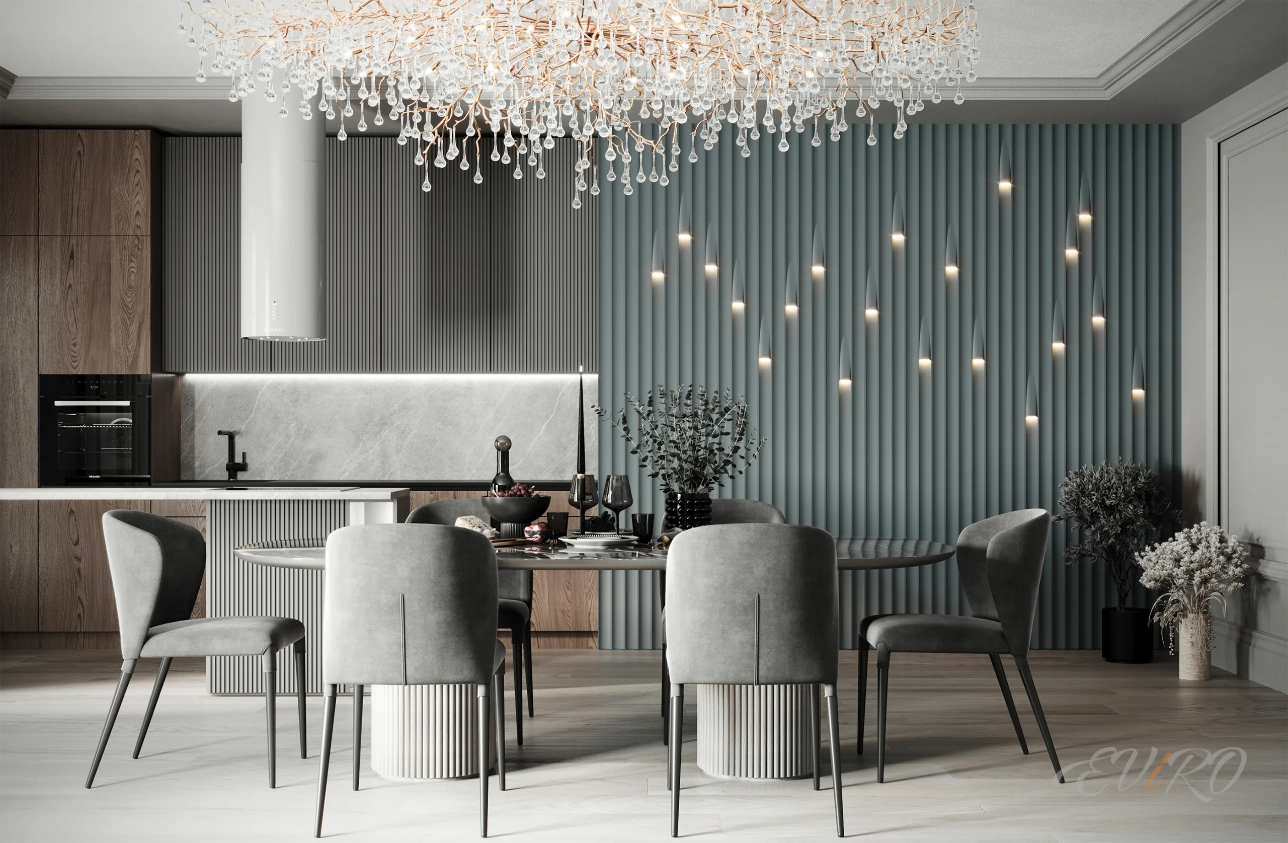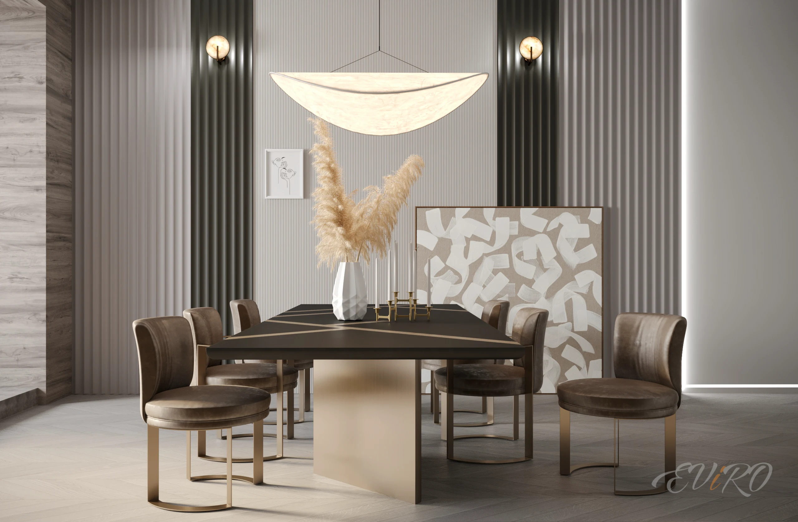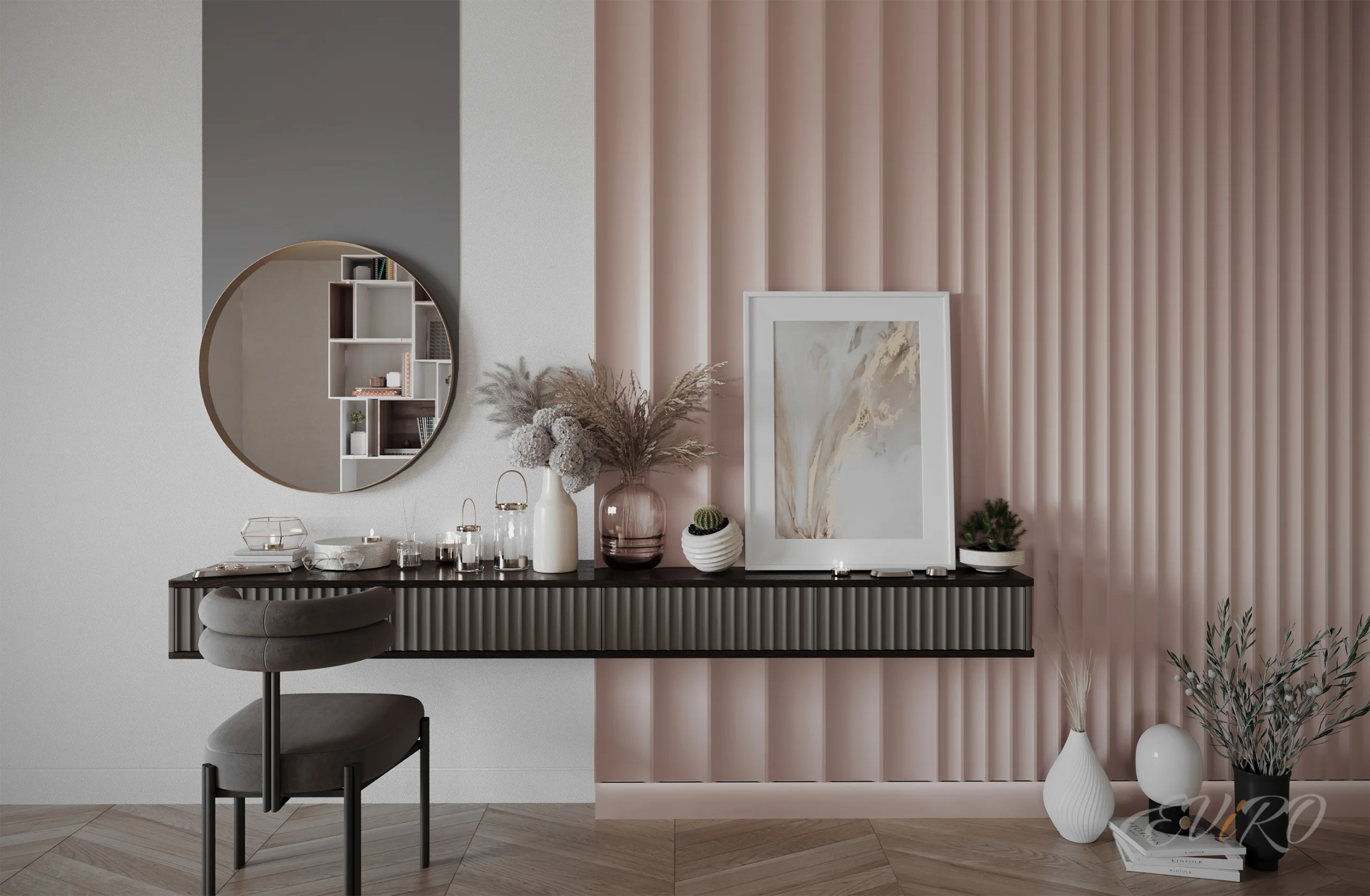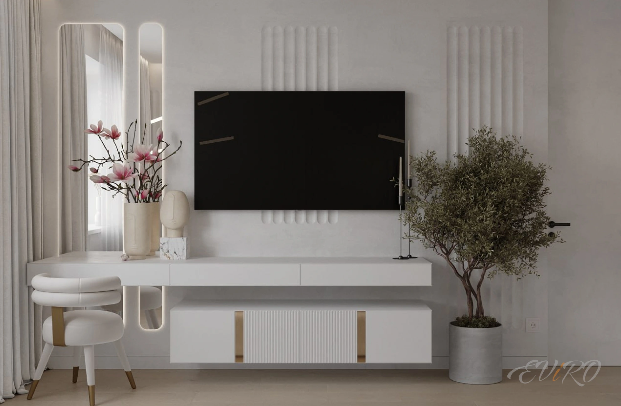 Сочетание панелей Eviro Спарта с мягкой рейкой добавляет тактильности и уюта в интерьер. Рейки могут быть выполнены в различных цветах и материалах, что позволяет подобрать идеальное сочетание с общей цветовой гаммой комнаты. Закругленные панели создают плавные переходы и смягчают углы, добавляя в интерьер нежности и романтики.